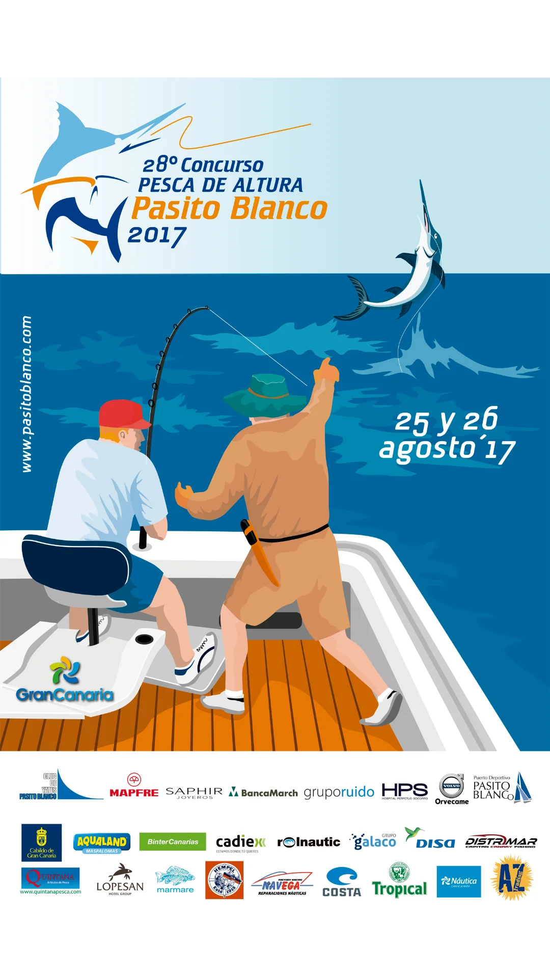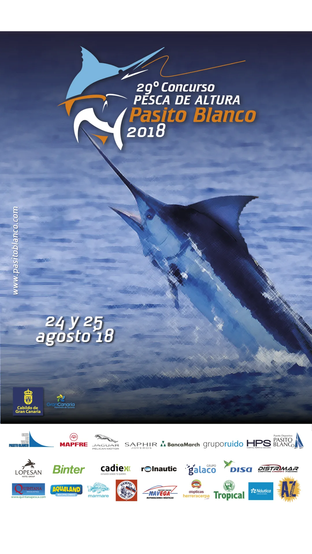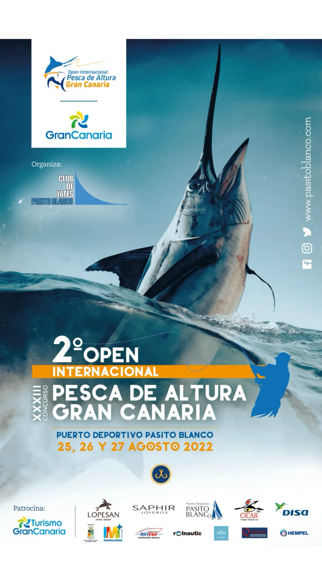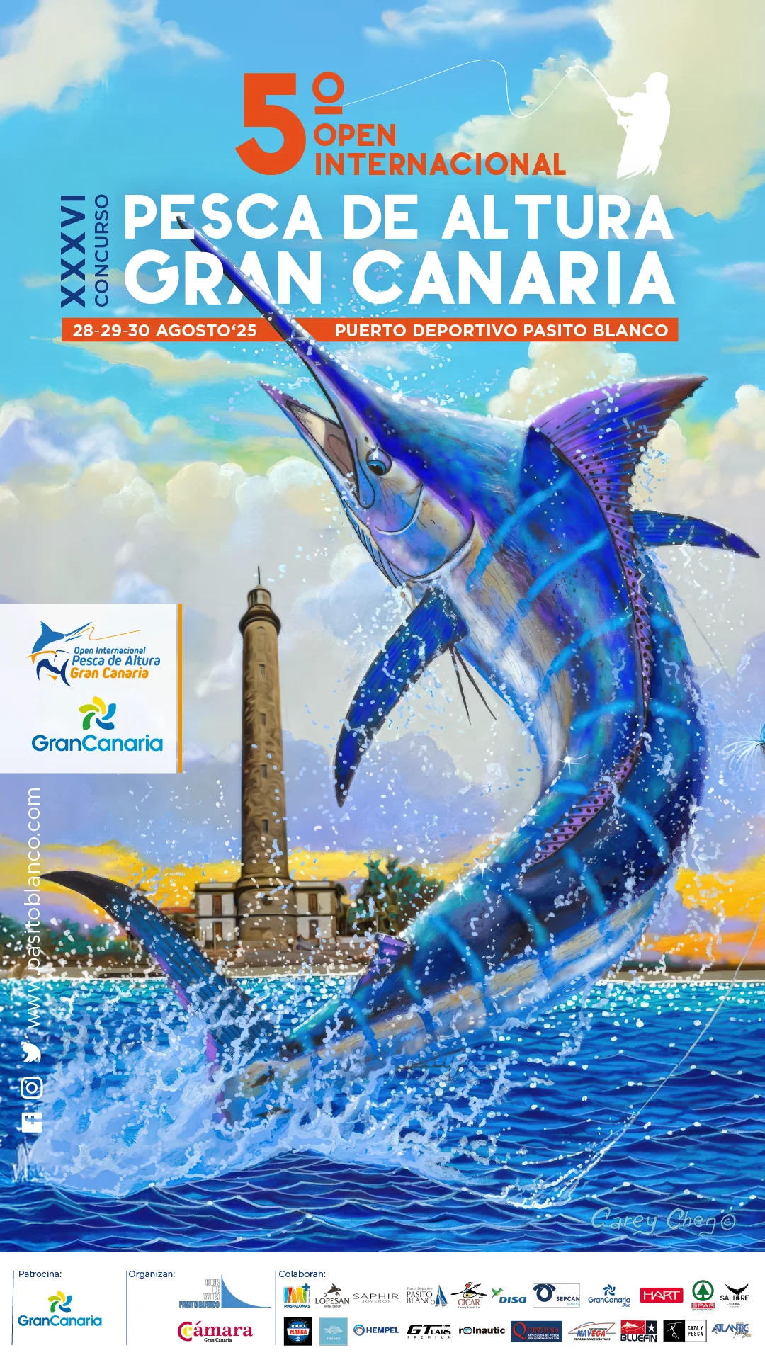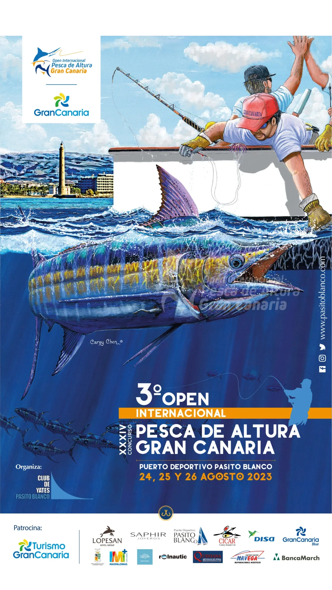 El Open Internacional Pesca de Altura Gran Canaria tiene sus raíces en el tradicional Concurso Pesca de Altura Pasito Blanco, un evento que comenzó hace más de tres décadas y que ha sido pionero en España en la práctica de la pesca deportiva responsable, especialmente bajo la filosofía de captura y suelta. Descubre la historia del concurso a través de sus carteles, que han evolucionado y en las últimas ediciones han contado con el trazado único y mundialmente reconocible del artista Carey Chen un artista ha logrado captar el mundo náutico y, especialmente, los Blue Marlin, a los que aprendió a amar y capturar, no solo a través de la pesca deportiva, sino también en sus lienzos.
